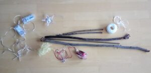 材料は、木の枝5~6本。同じ木の枝でも良いですが、いろいろな種類にすると変化が出て面白いものが出来上がります。私はわざわざ木の種類も太さも違うものを選びました(拾ってきました)。