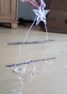 ひもの真ん中をてっぺんの星に付けて、ひもを枝に縛り付けて行きます。簡単なひと結びにしておくと、後でバランスが悪かった時などの調整が簡単です。