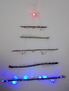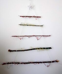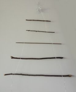 飾りは、自分の好きなものを選んでください。枝から星をぶら下げるとか、きれいな色のリボンをたくさん結び付けるとか。私は手持ちの飾りを使いましたが、クリスマスが近づくにつれて、飾りは増えて行くと思います。
