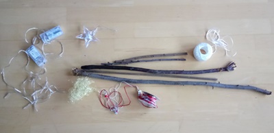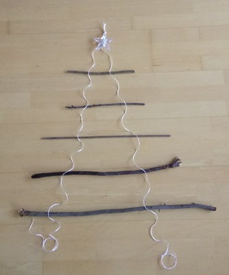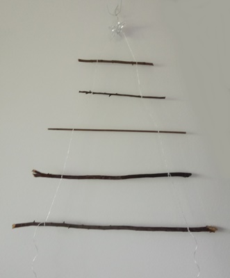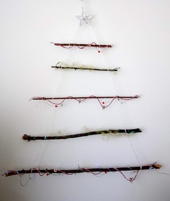 飾りは、自分の好きなものを選んでください。枝から星をぶら下げるとか、きれいな色のリボンをたくさん結び付けるとか。私は手持ちの飾りを使いましたが、クリスマスが近づくにつれて、飾りは増えて行くと思います。
