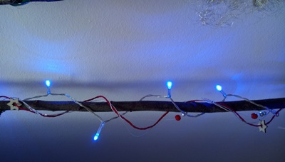 青い豆電球のついた飾りがあったので枝に巻き付けてみました。